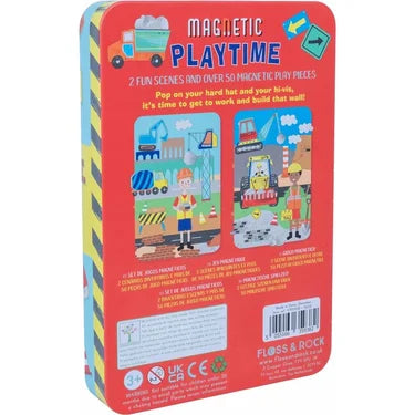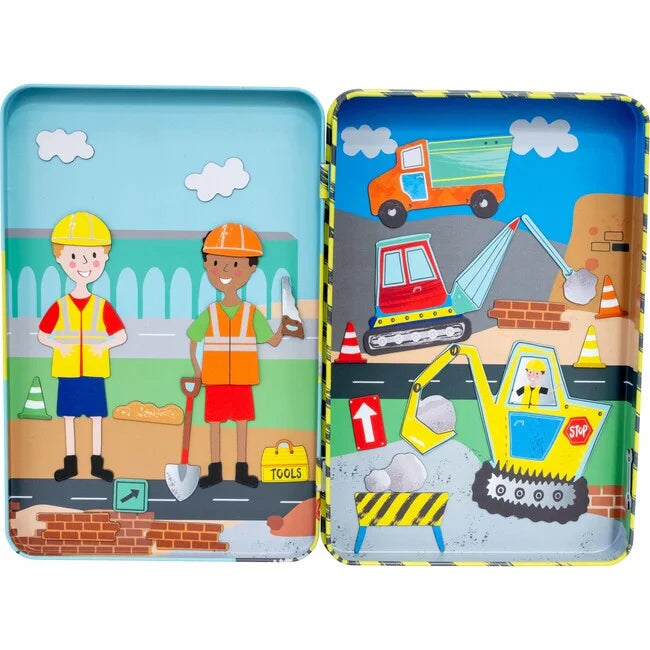 Playtime fun in a handy magnetic tin! Contains 3 sheets of pop out magnets so you can have fun sticking over 50 bright, fun magnetic pieces to the 2 fun scenes on the inside of your tin and let your imagination run wild. Create fabulous pictures with builders, diggers, trucks and much more. When you're finished playing, the magnetic tin safely stores all your pieces ready for next time. Brilliant for on-the-go.