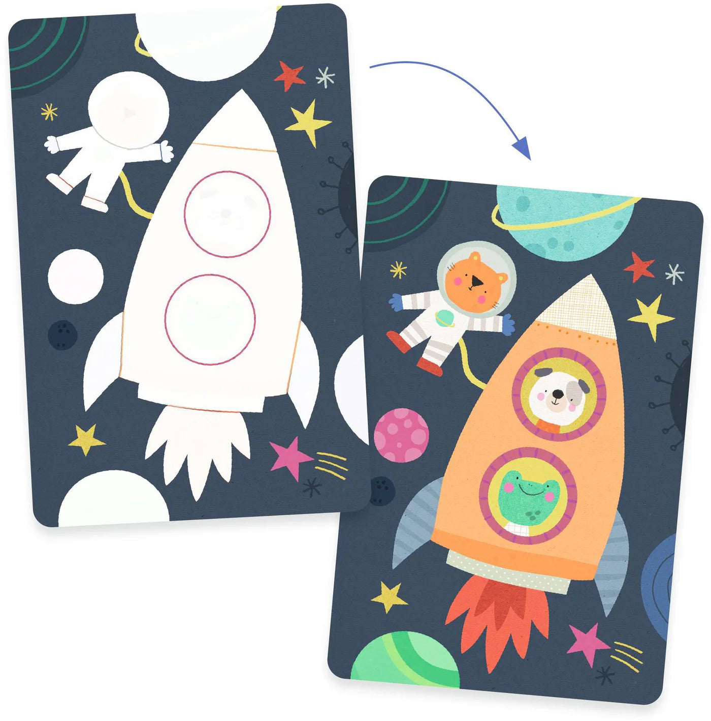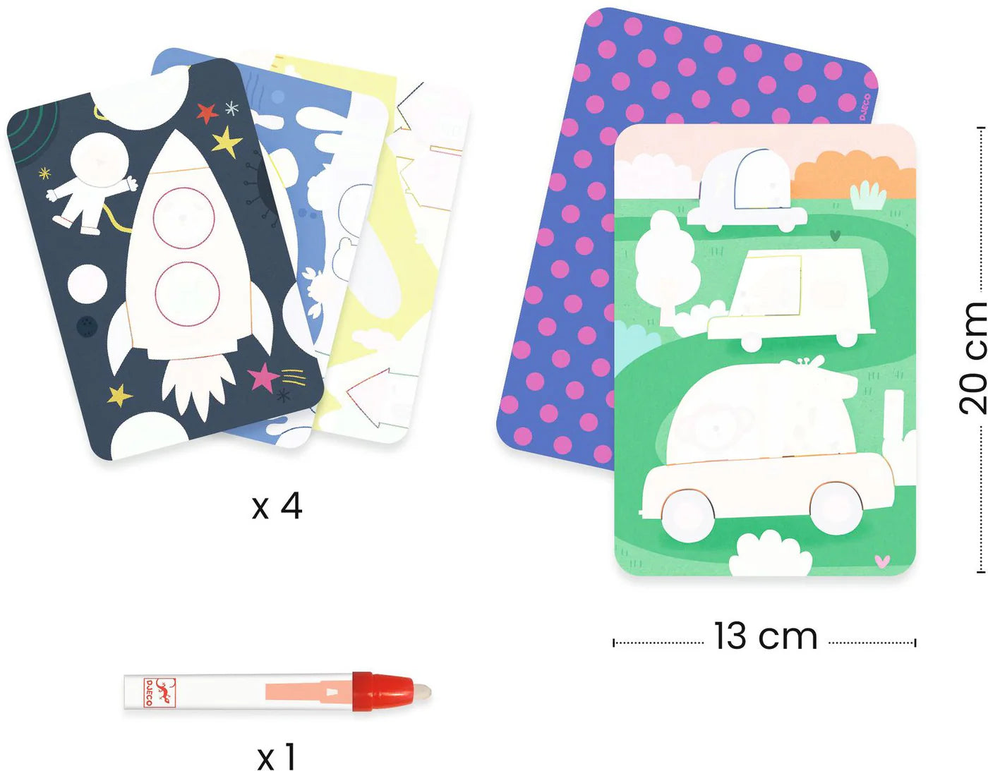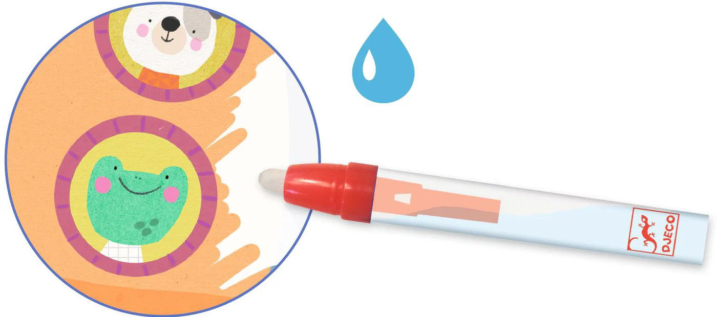 A water-coloring pocket perfect for children aged 18 months and up. Use the water-filled pencil to color in the white parts to reveal what’s hidden underneath. It’s magic: patterns appear and change color! Once the boards are dry, you can start all over again!