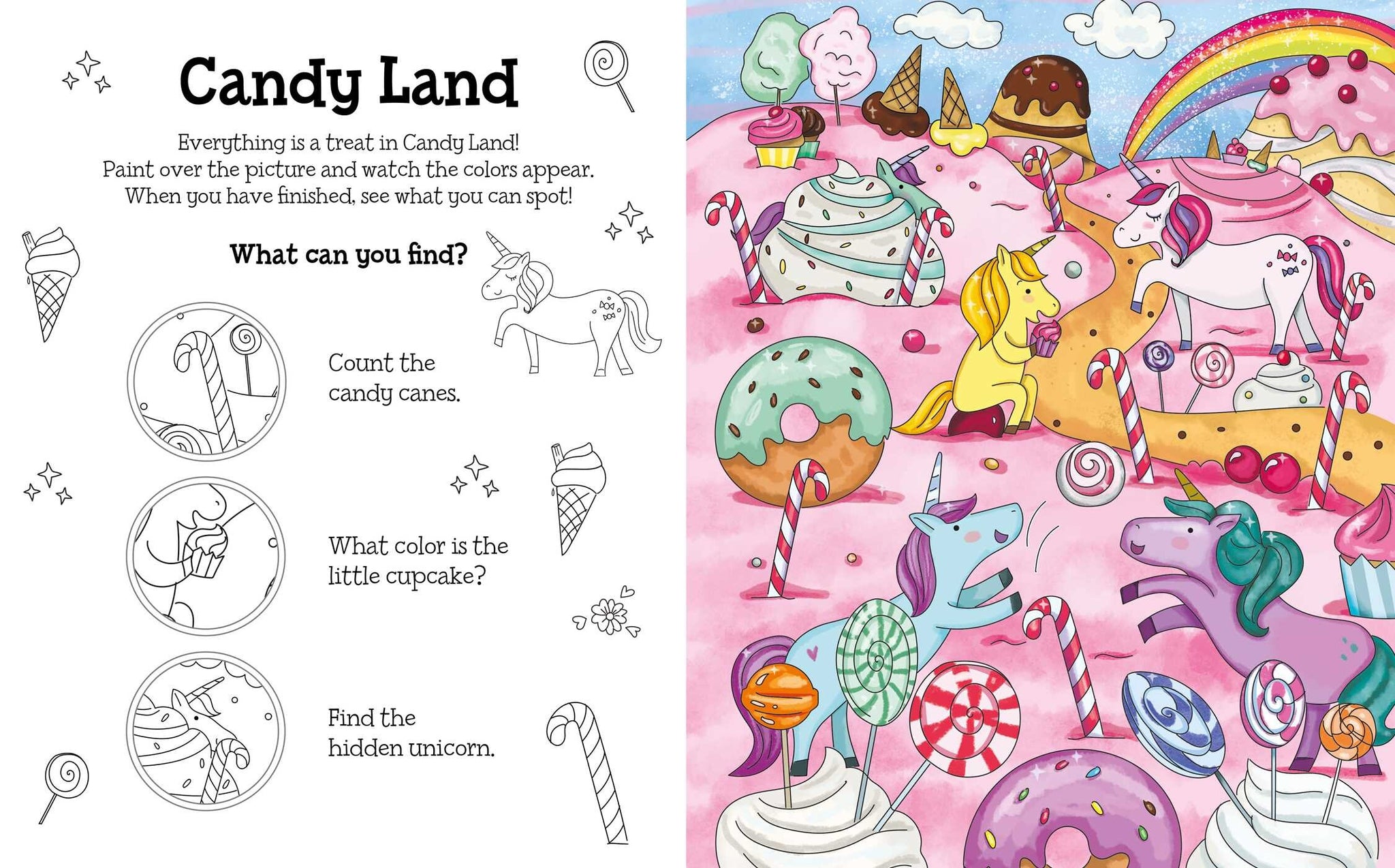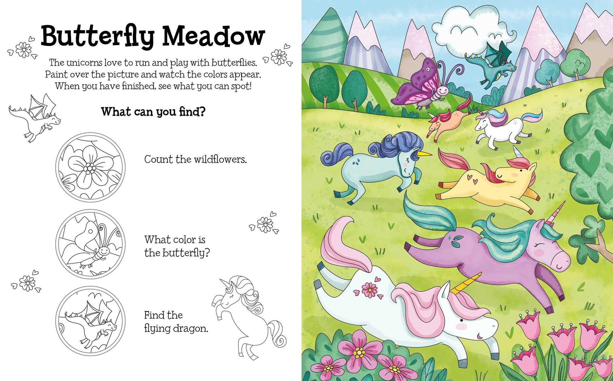 Like magic, scenes of playful unicorns come to colorful life when painted with the included water-filled brush! As the water dries, the color disappears and the sturdy pages can be painted again and again! Ten scenes show smiling unicorns and their dragon friends having fun searching for treasure, splashing in waterfalls, frolicking in a meadow and more! Each page also includes search-and-find challenges that support literacy-building skills.