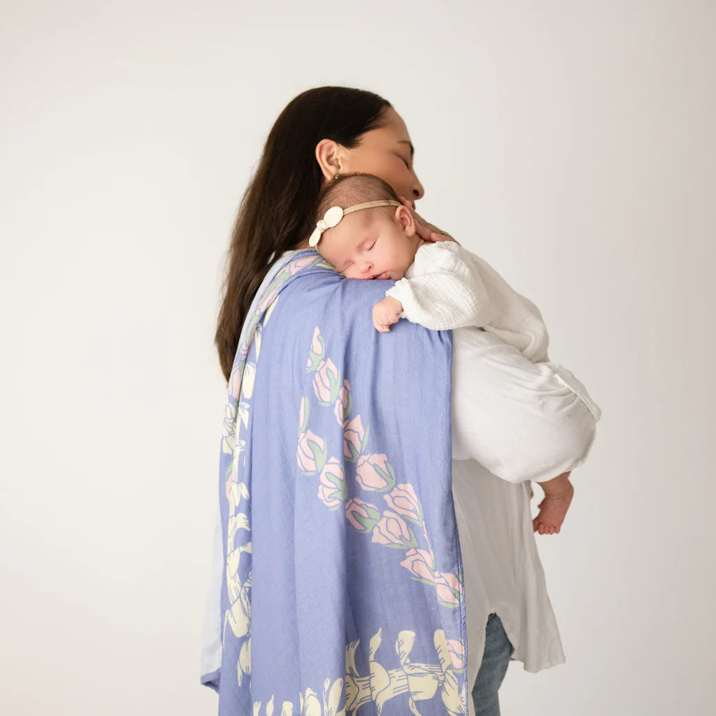 You'll love having this large, versatile muslin swaddle blanket close at hand to use as a nursing cover, stroller blanket, burp cloth, lovie, swaddle—the list goes on!