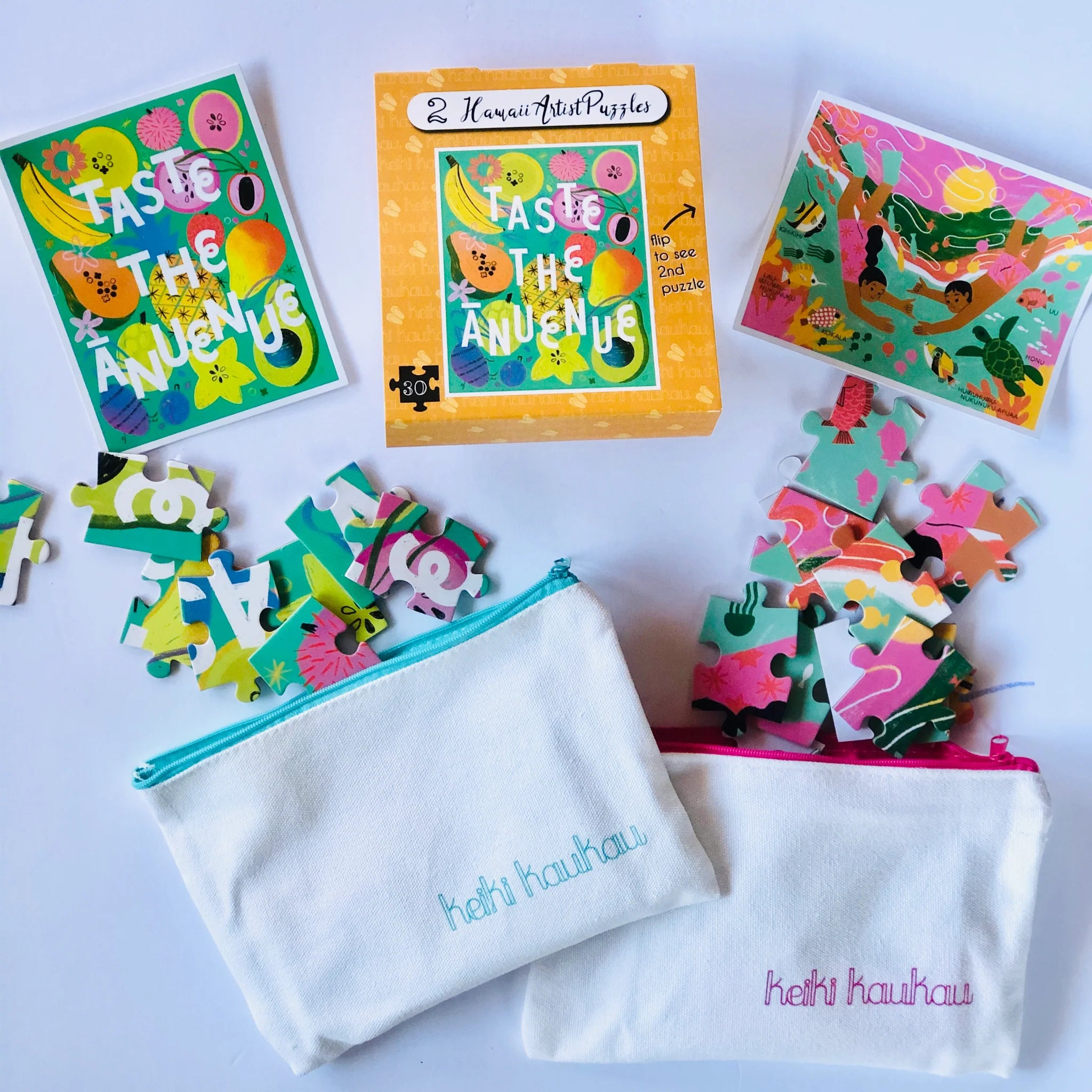 Double the puzzles, double the fun! Keiki Kaukau has teamed up with local illustrator Kimberlie Wong to create two delightful designs that are pretty enough to frame. “Taste the Ānuenue” celebrates the rainbow of yummy fruits and veggies found in Hawai’i, and “Dive In!” portrays two happy keiki in an undersea wonderland full of coastal marine life. Each 30-piece puzzles comes with a reference card and canvas logo pouch for fast and easy storage.